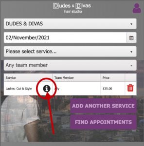 For example if you try to book a Ladies Cut you will see the INFO icon. The INFO will explain that a Ladies Cut applies to short hair. If your hair is long and you want the Ladies Cut to change your Long Style to a Short Style then the INFO will point out that the correct service for you is a Ladies Restyle.